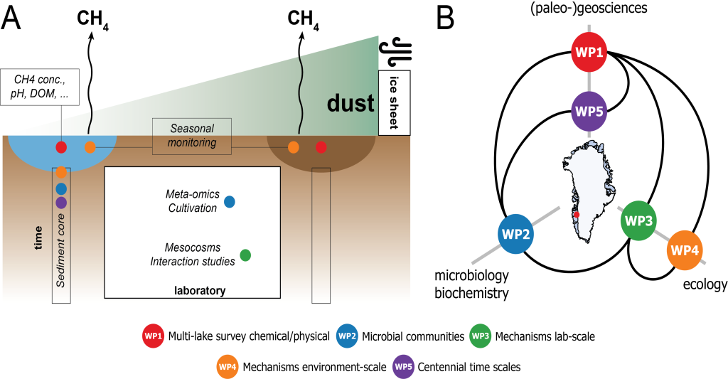 The research questions in CLIMET range in scale from molecular (genes, enzymes, metabolites) up to ecosystem scale, and consider lakes as part of an inter-connected landscape with variable fluxes of materials between land, atmosphere and water. The work plan therefore employs work packages (WP) that use methodologies and approaches from across microbiology (WPs 2, 3), microbial ecology (WPs 3, 4), lake ecosystem ecology and limnology (WPs 1, 4), earth and palaeo-sciences (WPs 1, 5).